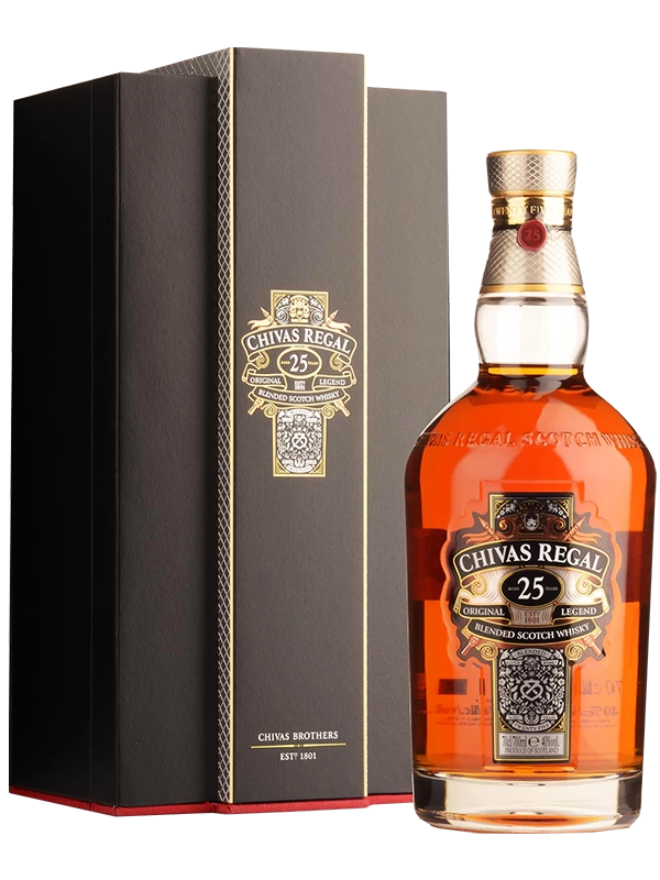 This is the newly designed Chivas Regal 25 Year Old. A is a truly memorable blend. Rich and nutty on the nose, the whisky develops a scrumptious toffee character alongside hits of aniseed and boiled sweets.