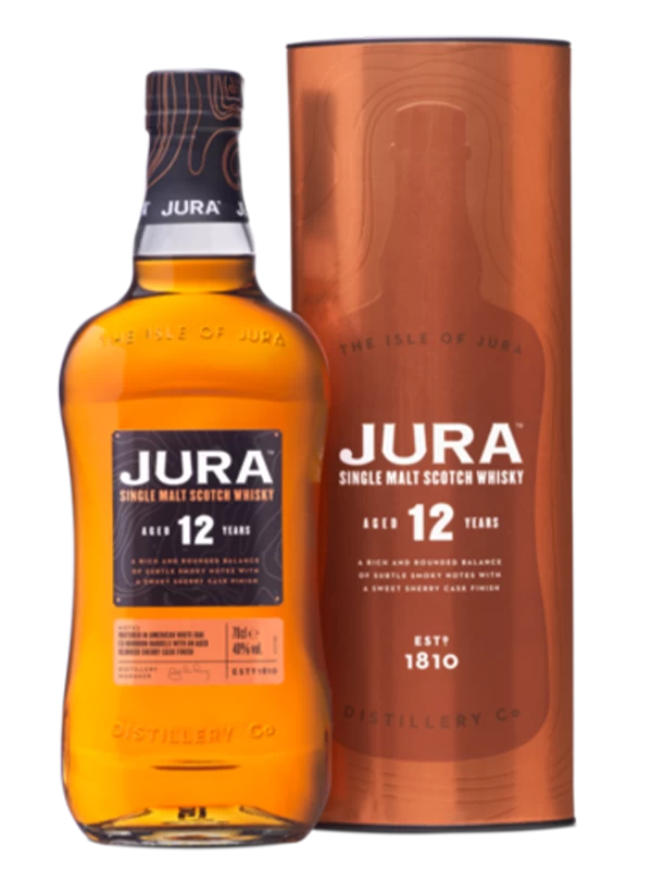 Jura 12 Year Old is the third of five new single malt whiskies from Jura. The new range ushers in a new era for the distillery and a new style comprised of fruit and subtle smoke. Like the Jura 10 Year Old, this is matured in bourbon casks before being finished in sweet sherry barrels. The whisky is left exposed to the fresh sea air, adding a slightly salty character to this dram.The Jura 12 is a rich and well rounded whisky with subtle smoke and obvious influences from the sherry cask finish. Theres chocolate, nuts and tropical fruit on the nose with the palate consisting of coffee, liquorice, salted bananas and brown sugar. The finish contains the subtlest hints of smoke.